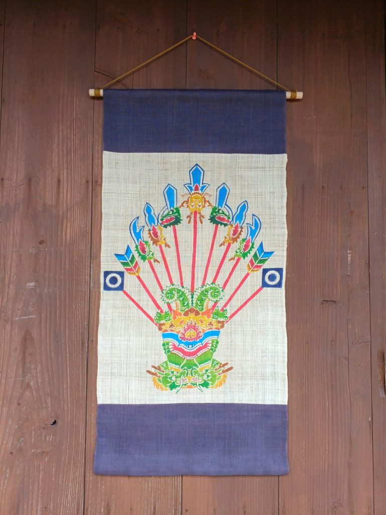 In Bingata Studio, we sell Bingata Dyeing dyed tapestries with yagaji pattern and handmade Japanese paper yakaji pattern postcards at the paper making workshop. Recommended for birth celebrations and families with boys.